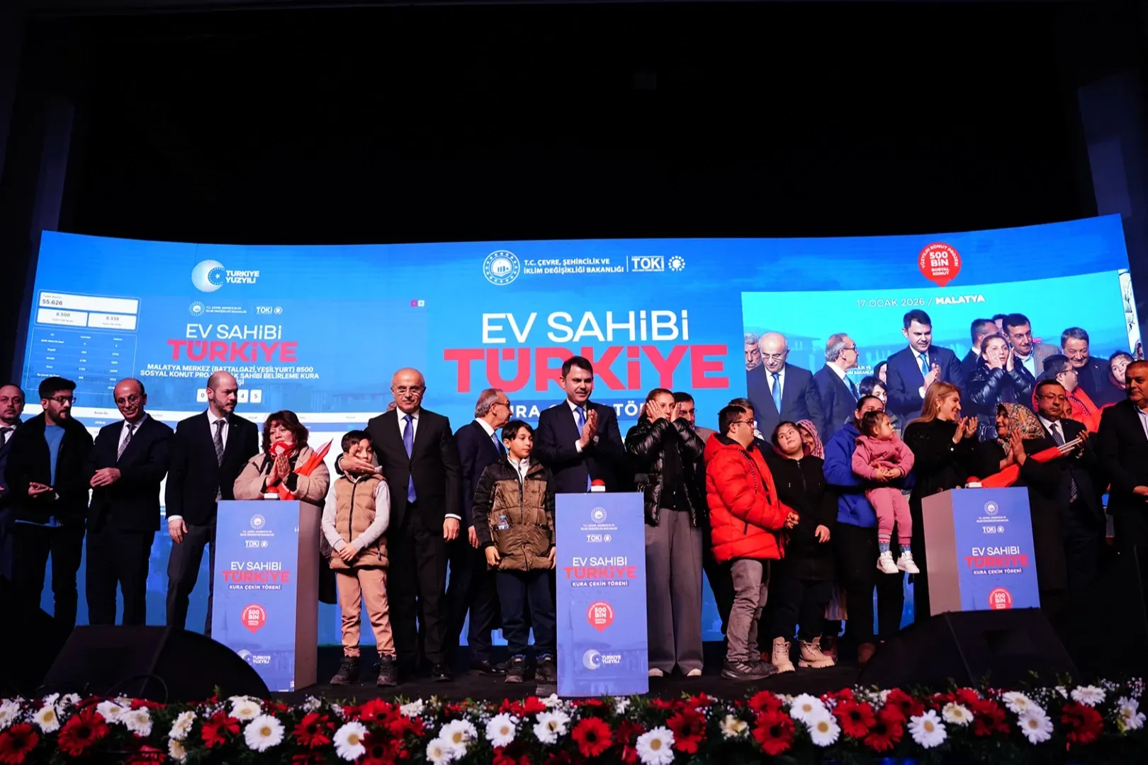 MALATYA (İGFA) - Cumhurbaşkanı Recep Tayyip Erdoğan’ın açıkladığı 81 ilde 500 bin sosyal konutun inşa edileceği “Yüzyılın Konut Projesi” kapsamında hak sahiplerinin belirlendiği kura çekim töreni bugün Malatya’da yapıldı. Noter huzurunda 9 bin 659 konutun hak sahiplerinin belirlendiği kura törenine Çevre, Şehircilik ve İklim Değişikliği Bakanı Murat Kurum, Malatya Valisi Seddar Yavuz, AK Parti Malatya Milletvekili Bülent Tüfenkci, Toplu Konut İdaresi (TOKİ) Başkanı Levent Sungur, Malatya Büyükşehir Belediye Başkanı Sami Er, yerel yöneticiler ve vatandaşlar katıldı.