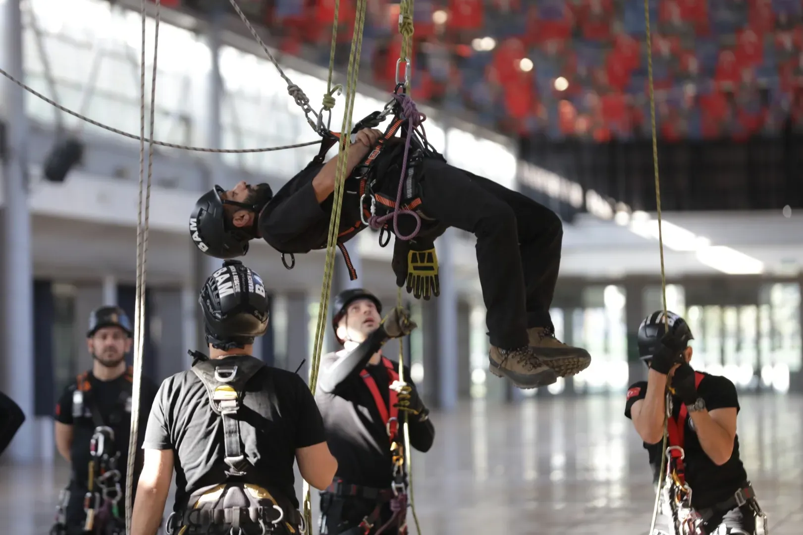 Merinos Yerleşkesi Fuaye Alanı’nda ‘İple Kurtarma Sistemleri ve Arama-Kurtarma eğitimi’ alan ekipler, uzman eğitmenler eşliğinde tavana asılı halatlara güvenlik ekipmanlarını kullanarak tırmandı.