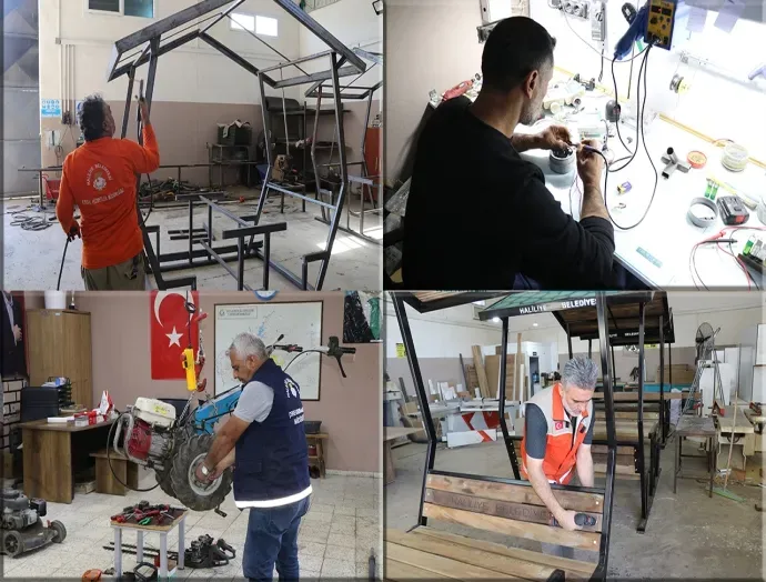 Belediye bünyesindeki Metal-İş, Boyama ve Ahşap Atölyelerinde görev yapan ekipler, park ve yeşil alanlarda kullanılan donatı elemanlarını kendi imkanlarıyla üretiyor. Kaynak ve boyama işlemleri tamamlanan ürünler monte edilerek kısa sürede vatandaşların hizmetine sunuluyor. Bu sayede hem zaman hem de maliyet açısından önemli tasarruf sağlanıyor.