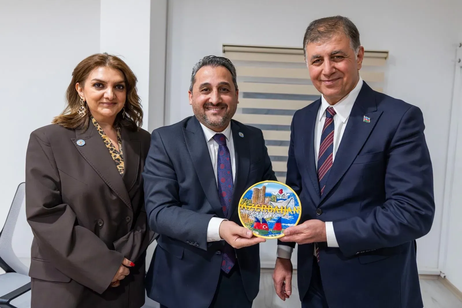 İZAZDER Başkanı Perviz Altay, ziyaretin sonunda Başkan Tugay’a Azerbaycan Cumhuriyeti bayraklı rozet taktı.