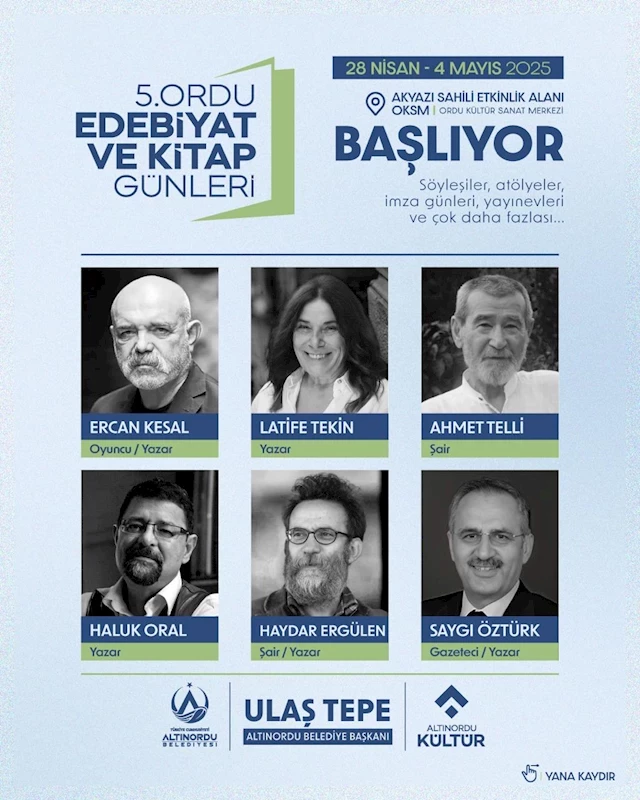 Altınordu Belediyesi tarafından bu yıl 5’incisi düzenlenecek olan Ordu Edebiyat ve Kitap Günleri, 28 Nisan Pazartesi günü başlıyor. Aralarında Ercan Kesal, Latife Tekin, Haydar Ergülen, Ahmet Telli, Saygı Öztürk gibi birçok ünlü yazar ve şairin bulunduğu etkinliklerle bir hafta boyunca Ordu’da edebiyat rüzgarı esecek.