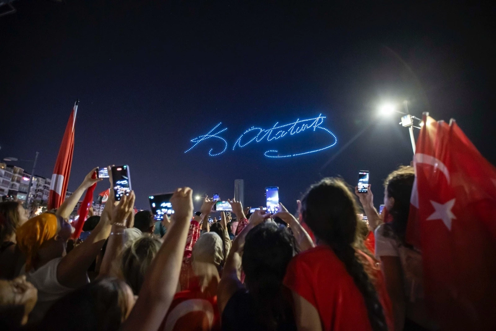 30 Ağustos Zafer Bayramı kutlamaları, İzmir’de unutulmayacak anlara sahne oldu. İzmir Büyükşehir Belediyesi’nin Gündoğdu Meydanı’nda düzenlediği dron gösterisi kentte görsel şölen yaşattı. Tam 500 dronun gökyüzüne yükselerek Atatürk portresi, Türk bayrağı gibi sembolleri oluşturduğu gösteride, İzmirli yurttaşlar da ellerinde Türk bayrakları ile coşkuya ortak oldu.