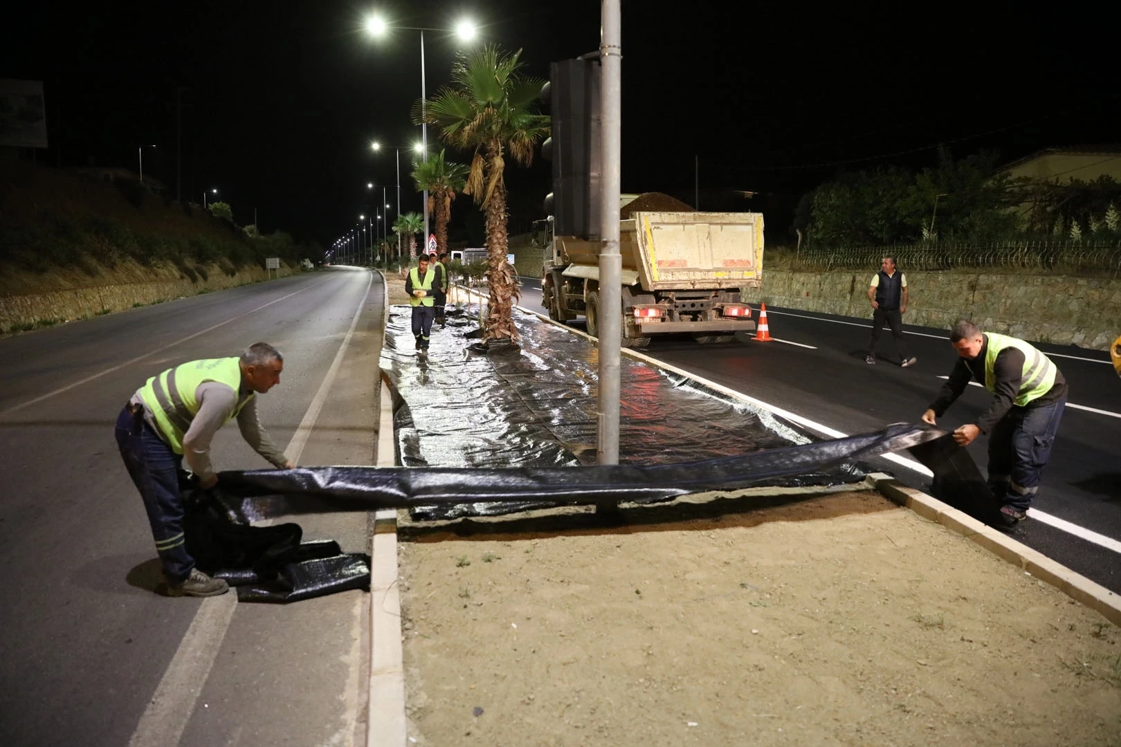 Güzelbahçe Belediyesi Park Bahçeler Müdürlüğü 7 kilometrelik Seferihisar orta refüj çalışmasını gece mesaisinde de yapmaya devam ediyor.